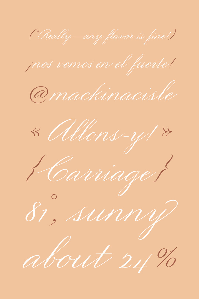 Drafted during the 2019 Mackinac State Historic Parks Artist-In-Residence Program, Mackinac 1895 is a script typeface inspired by handwriting discovered in a ledger from 1895, the year the Mackinac Island State Park Commission was founded. The handwriting used to inform this typeface recorded the realities of daily life on this picturesque island, noting names of steamers entering the harbor and amounts of wood or coal. The hand of its author was deliberate and careful, thoughtfully tracing back over inked letterforms to create elegant titles. How telling, that in the midst of the every day, time was taken for beauty.